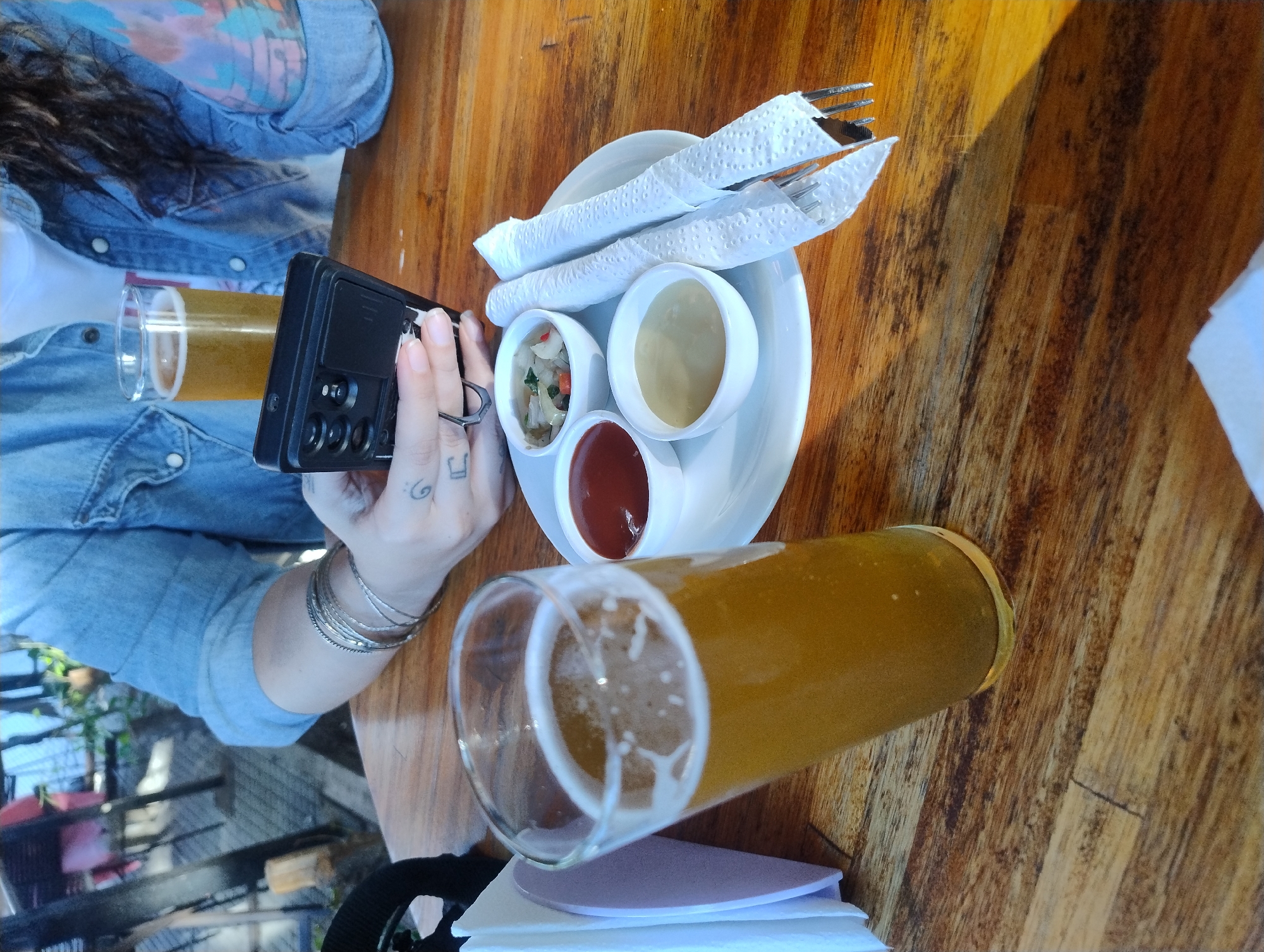 The image depicts a close-up, elevated view of a wooden table at an outdoor cafe or restaurant, located in Buenos Aires, Argentina. The scene is brightly illuminated by natural light, casting distinct shadows on the table surface. One individual is partially visible from the chest up on the right side of the frame. This person is wearing a blue denim jacket over a white t-shirt, and has long, dark, curly hair. Their left forearm, adorned with multiple silver bangles, rests on the table. Their left hand, which has a "C" tattoo on the ring finger and a spiral symbol on the middle finger, firmly grasps a black smartphone with a prominent, multi-lens camera module. A second person is implied by the presence of an additional glass of beer in the background, though no other details about this individual are discernible. On the table in the foreground, a tall, clear glass is filled with amber-colored beer, topped with a thin layer of white foam. To its left, a stack of white, folded paper napkins is present. Centrally positioned on the table is a white ceramic plate holding three small, white ceramic bowls. The top bowl contains a mixture of chopped vegetables, appearing to be a relish or salsa with visible onions, peppers, and herbs. The middle bowl holds red ketchup, and the bottom bowl contains a light yellow or cream-colored sauce, likely mayonnaise or aioli. Two metal forks, each individually wrapped in white textured paper napkins, rest on the plate beside the bowls. A second, smaller glass of amber beer is visible further back on the table, behind the smartphone. The background, out of focus, reveals an outdoor environment typical of a patio or sidewalk cafe. Visible elements include metal chairs, parts of other tables, green foliage, and light-colored paved ground, with a clear blue sky overhead. The visible person is actively holding and observing their smartphone.
