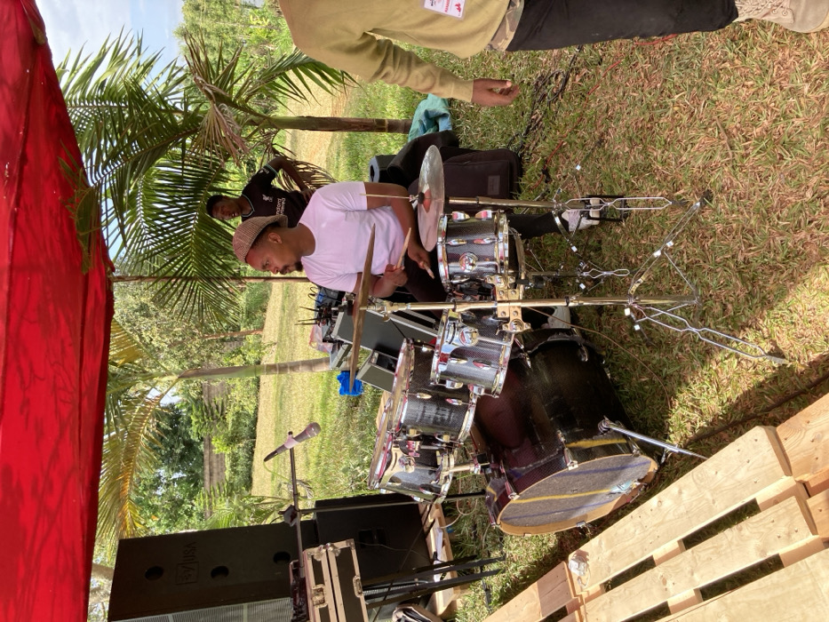 The image displays an outdoor musical event setup in Murera ward, Kenya, under a red canopy during daylight hours