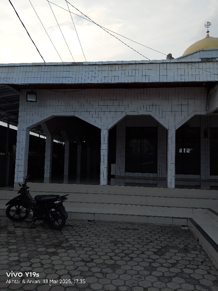 view of the exterior of a mosque in Kecamatan Gabuswetan, Indonesia, with coordinates of -6.44 latitude and 108.028 longitude. The mosque is constructed of white tiled walls and has several arched doorways. The doorways are shaded and dark, leading to the interior of the mosque. In the foreground, there is a black motorcycle parked on a paved area of interlocking hexagonal stones. The pavement is a little dirty. There are three steps leading up to the mosque entrance. There are several electrical wires running across the sky. Above the roofline of the mosque, a small golden dome and a crescent moon are visible. The sky is overcast and gray.
