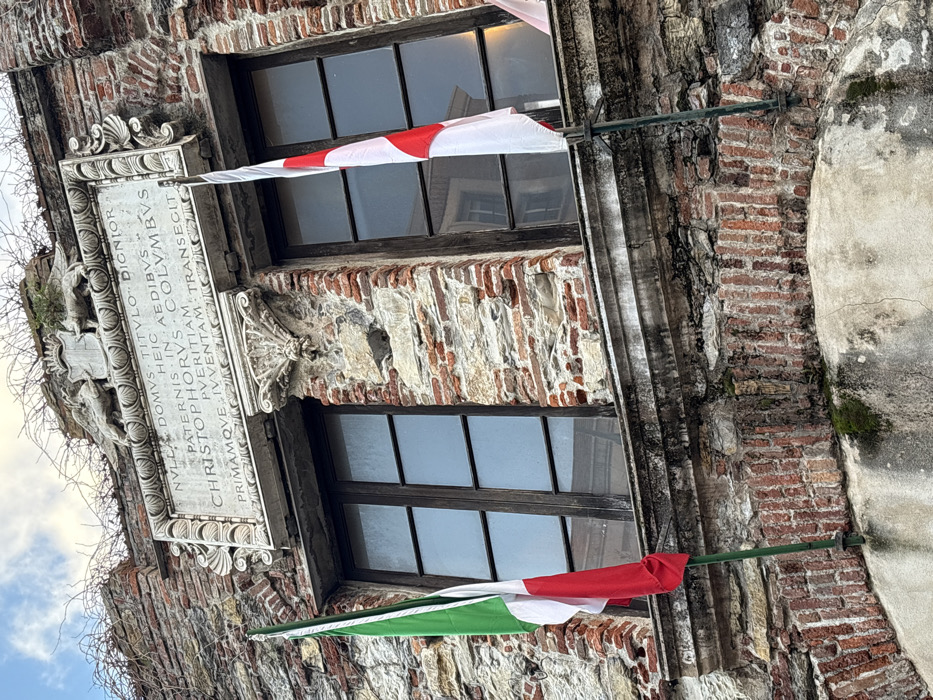 The image depicts a low-angle view of an aged brick and stone building facade, identified as the House of Christopher Columbus in Genoa, Italy. The structure features exposed reddish-brown bricks, grey hewn stone blocks, and areas of worn plaster, exhibiting significant weathering and some moss growth. Centered on the upper portion of the facade is a large, ornate white marble plaque. This plaque features relief carvings at its apex, depicting two rearing animals, possibly lions or griffins, flanking a central shield or crest. Below the carvings, a Latin inscription is etched, reading "NULLA DOMUS HEIC TITULO DIGNIOR / PATERNA IN AEDIBUS / CHRISTOPHORUS COLUMBUS / PRIMAMQUE JUVENTAM TRANSEGIT," which translates to "No house more worthy of a title / (than) the paternal house in which / Christopher Columbus / passed his first youth." Below the plaque, two rectangular windows with dark frames are visible. The window panes reflect a cloudy sky and parts of the surrounding urban environment. Between and to the sides of the windows, the brick and stone masonry is interspersed with decorative, carved stone corbels or capitals. Two flags hang vertically from poles affixed to the wall below the window sill. On the left, an Italian national flag (green, white, and red vertical stripes) is attached to a dark green pole. On the right, a Genoese flag (a white field with a red cross, commonly known as St. George's Cross) is attached to a dark-colored pole. Above the building's roofline, barren tree branches and sparse vegetation are visible against a partly cloudy sky. No individuals are present in the scene.