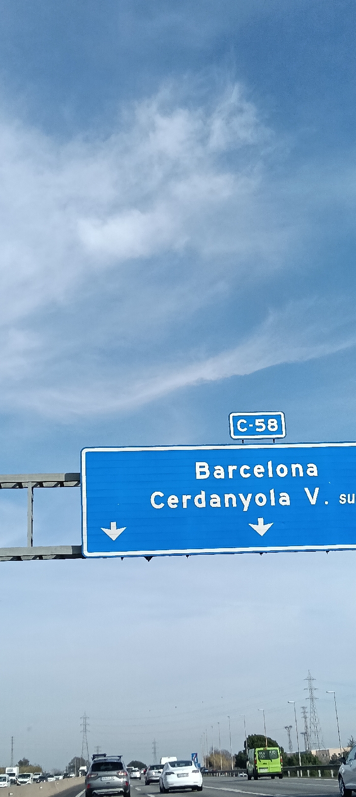 The image depicts a multi-lane highway scene under a blue sky with scattered white clouds. A prominent blue overhead highway sign, supported by a grey metal gantry, is centered in the upper mid-ground. The sign displays "C-58" in a smaller blue rectangle at the top. Below, in white text, it reads "Barcelona" and "Cerdanyola V. su", with two white downward arrows indicating lanes. This places the location on the C-58 highway near Cerdanyola del Vallès, Spain. The highway exhibits moderate traffic, with numerous passenger vehicles, including a silver SUV with roof racks in the foreground, a white Tesla sedan, and a green delivery van in the right mid-ground, all traveling in the same direction. Tall metallic utility towers and streetlights are visible on the right side of the highway in the background, alongside sparse vegetation and distant urban or industrial structures. The perspective is from within a moving vehicle, looking forward.
