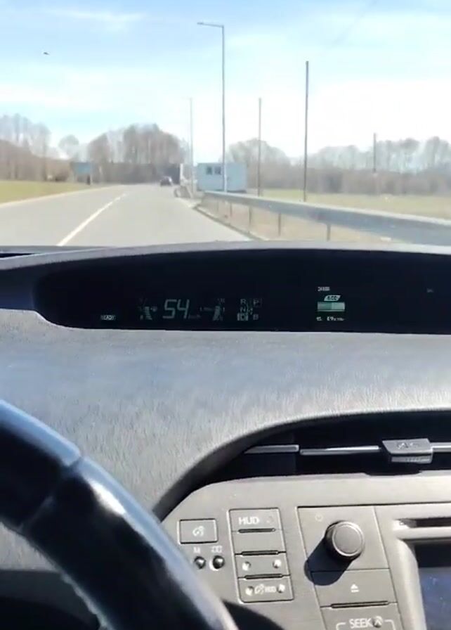 driver in the driver's seat of a car, driving on a road. The car's dashboard is visible, showing the car's speed increasing from 54 to 60 km/h. The road has streetlights and a metal guardrail along the side. There is a sign visible that reads "Игнатово". The weather is sunny and the sky is blue. There is music playing from the car's audio system.