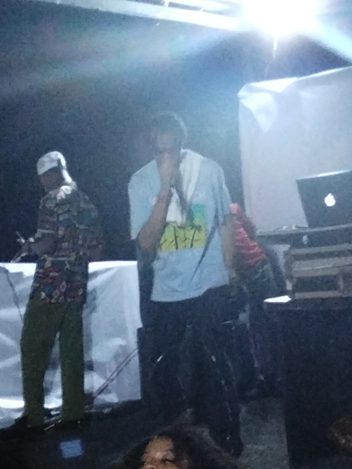 Two men are on a stage. One man, wearing a white baseball cap and a patterned shirt, stands to the left. The other man, wearing a light blue t-shirt and black pants, stands to the right with a microphone to his mouth. A laptop sits on a table behind him. There's a bright light above them. A person's head is visible at the bottom of the frame.