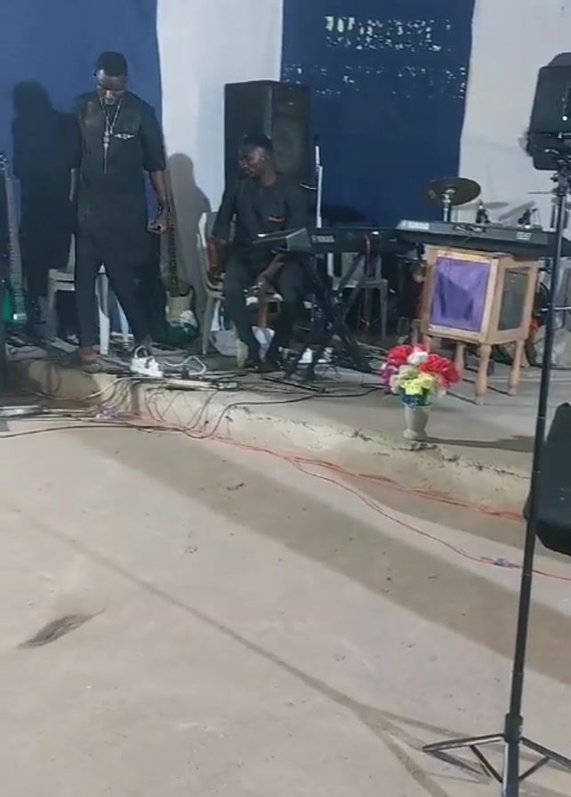 group of people preparing for an event in what appears to be an indoor space. A man in a black outfit walks across the room while another man sits at a keyboard, seemingly setting up or playing music. There are speakers, wires, chairs, and other equipment around, suggesting a stage setup. Some people are sitting in chairs, possibly waiting for the event to start. The environment looks like it could be a community hall or a similar venue, given its size and basic decoration. The general lighting is somewhat dim.