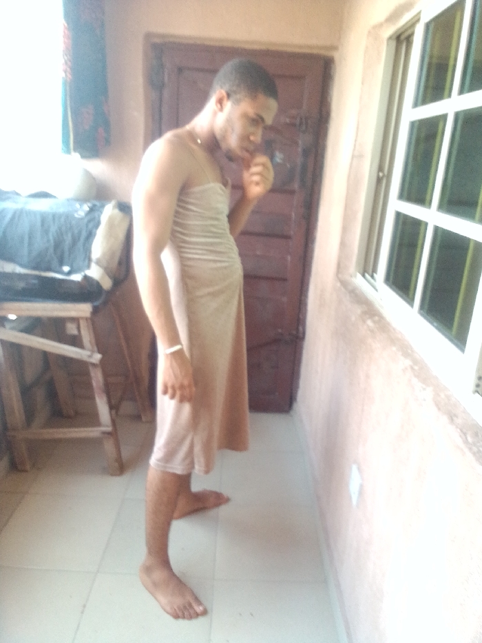 The image depicts a single individual standing indoors in the city of Unknown, Unknown. The subject, a young male with short dark hair and visible facial stubble, stands barefoot on light-colored tiled flooring. He wears a light-colored, possibly beige or pale pink, sleeveless garment with thin straps, resembling a slip dress, that extends to mid-calf. A thin chain necklace is visible around his neck, and a white bracelet is on his left wrist. He is positioned with his body slightly angled to the right, head tilted downwards, and his right hand raised near his mouth. In the left background, a wooden stool supports draped dark and light fabrics. A closed, dark brown wooden door with a visible handle is centered behind the individual. To the right, a white-framed window with multiple panes is present, with a white electrical outlet visible on the light-colored wall beneath it. The room is illuminated by natural light.