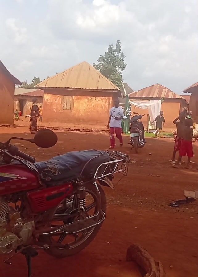 village scene with small children playing in a reddish-brown dirt yard. There are several small, rectangular buildings with rusty metal roofs. A person in a white shirt and red pants walks past a parked motorcycle. Another motorcycle is parked in the foreground. A dark blue car is parked near one of the buildings. Some adults are standing around the area, watching the children play. The sky is mostly cloudy. There is music playing.