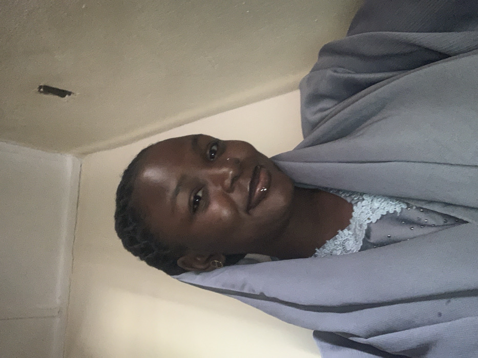 A close-up, frontal portrait features a single young adult female against an interior background. She has dark skin, dark braided hair, and is looking directly towards the viewer with a slight smile. Facial adornments include a silver stud in her left nostril and a horizontal silver labret piercing positioned below her lower lip. A small gold-colored hoop earring is visible in her right ear. She is wearing a light grey or blue head covering that drapes over her shoulders and a lighter blue garment featuring lace-like ornamentation around the neckline, with small, reflective embellishments visible on the chest area. The background consists of plain, light-colored interior walls and a ceiling. A dark, vertically oriented, rectangular defect or opening is present on the upper right wall. The specific location within Tumfure, Nigeria, is not discernible from the visual information provided.