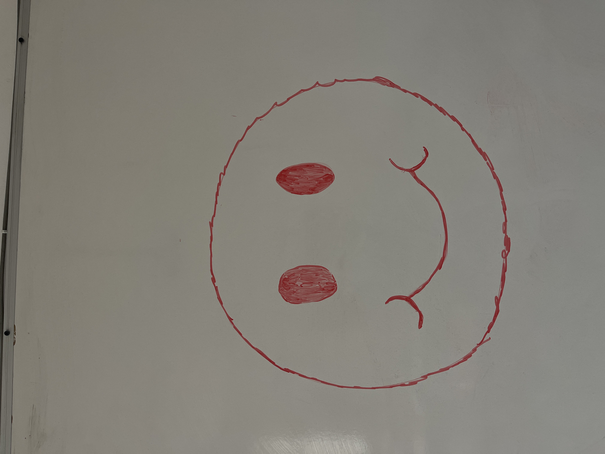 A crude drawing of a smiley face is on a whiteboard. The face is drawn with a red marker. The eyes are two ovals stacked vertically. The mouth is a curved line. The location is unknown.