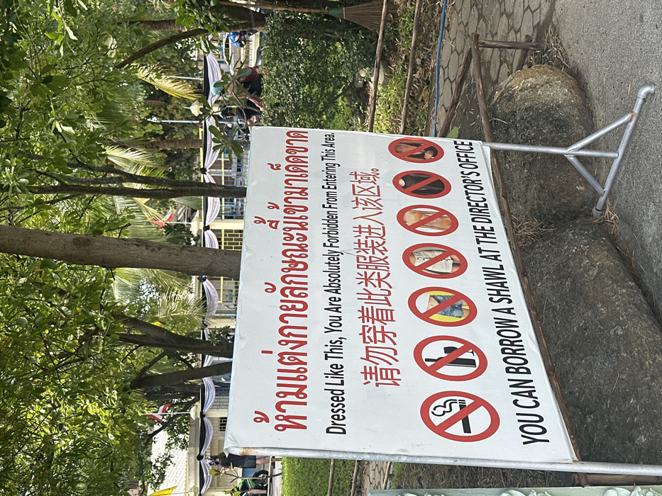 A sign stands near greenery and two large rocks. The sign prohibits entry to individuals dressed in a certain manner. Specifically, it shows symbols of clothing styles that are not allowed: bare shoulders, swimwear, casual clothing, shorts, footwear of some sort, and smoking. In English, Thai, and Chinese, the sign indicates that these styles are forbidden and that a shawl can be borrowed at the director's office.