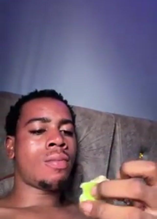 A shirtless young man with short dark hair is sitting against a grey, upholstered headboard. He is facing the camera and eating a small green object, possibly a piece of fruit or vegetable, with his hand. The background is a plain, light blue wall, and there are what appear to be light streaks from a window in the upper-left corner of the frame. He chews, looks at the camera, and seems to be making slight facial expressions after he eats.