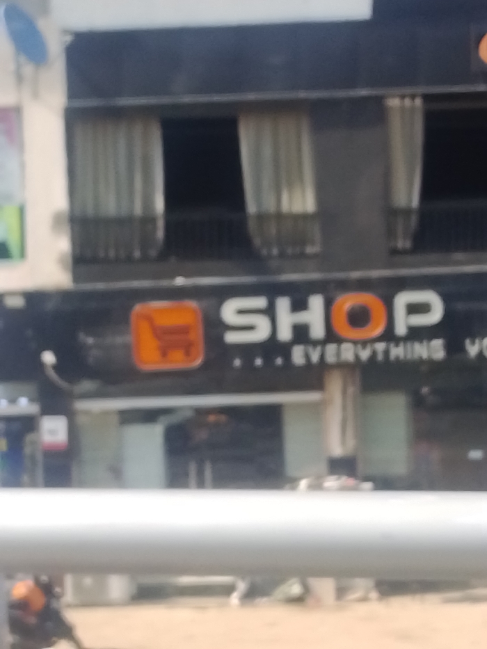 This image depicts the exterior of a commercial building and its immediate foreground in Lokoja, Nigeria. The building features a dark-colored facade. On its upper level, two distinct openings are present, each partially covered by light-colored vertical blinds and fronted by dark railings. A blue satellite dish is visible on a lighter wall section to the far left of the upper level. The lower level of the building features a prominent sign with a dark background. The word "SHOP" is displayed in large white capital letters, with the letter 'O' colored orange. To the left of "SHOP," an orange square icon containing a stylized dark orange shopping cart is visible. Below the primary text, smaller white lettering reads "...EVERYTHING V...". Below this sign, the ground floor entrance area is obscured by reflections in glass, with a vertical support pillar visible. A light-grey horizontal bar or railing occupies the lower third of the frame, partially obscuring the immediate foreground. Below this railing, the ground appears to be a light brown, unpaved or sandy surface. On the far left of the foreground, a dark vehicle, potentially a motorcycle or scooter, with an orange component, is partially visible. No individuals or specific actions are discernible within the frame.