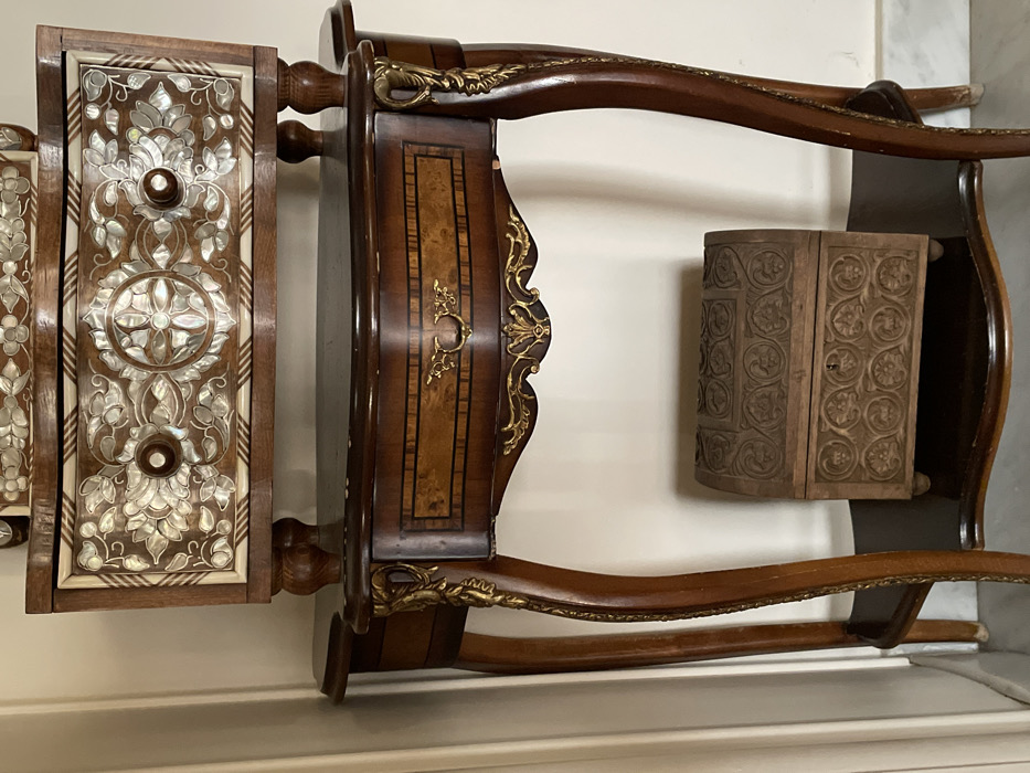 The image displays a static interior scene within the city of Kafr Sousa Municipality, Syria, featuring three ornate wooden furniture pieces against a plain, light-colored wall. A dark brown console table with curved, cabriole-style legs, featuring gold-colored decorative metalwork on its upper legs and a single drawer with marquetry inlay and a brass pull, occupies the center. The table's top surface shows minor wear. Resting centrally on the console table is a smaller, dark wooden vanity or jewelry box, heavily inlaid with intricate mother-of-pearl floral and scroll patterns. This box includes a front drawer with two small wooden knob handles, adorned with a large circular floral motif. On the lower shelf of the console table, a small, lighter brown wooden chest with a domed lid is present. The chest is extensively covered in carved relief patterns, primarily floral and scroll motifs, and features a small keyhole on its front. No individuals or actions are depicted.