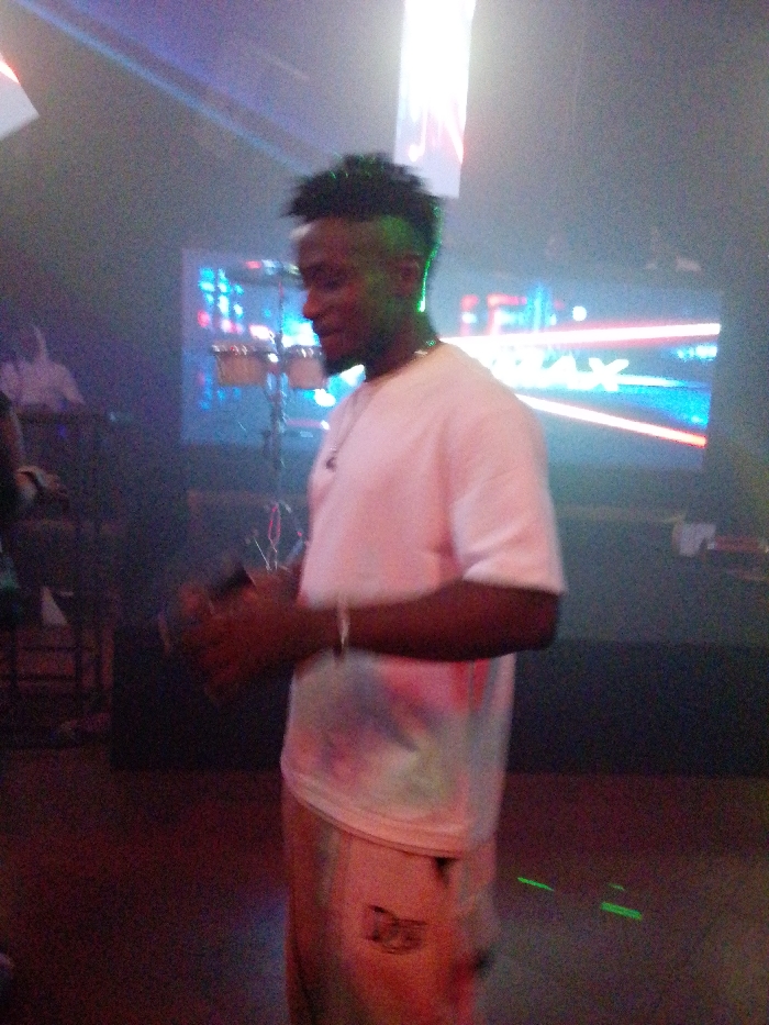 In a dimly lit nightclub with neon lights, a dark-skinned man with a unique hairstyle stands in profile. He wears a light pink t-shirt and matching pants with a graphic on the thigh. He seems to be holding something in his hands. Behind him, a screen displays colorful, abstract patterns, and other patrons are visible in the background. The atmosphere is smoky, creating a hazy effect in the image.