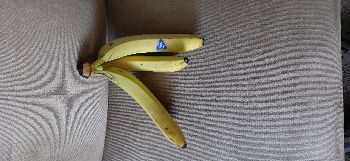- "Three bananas, predominantly yellow with some green areas and dark brown distal ends, are resting on a light beige, vertically ribbed, upholstered fabric surface" by FM-4bmeH3, licensed under CC BY 4.0