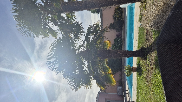 The scene depicts an outdoor residential or leisure area in Châtelaillon-Plage, France, under a bright sky with scattered clouds. A prominent sun in the upper left generates significant lens flare across the image. Two palm trees with thick, textured trunks and fan-shaped green fronds are centrally positioned. The central palm tree's lower fronds exhibit a vivid yellow-green illumination from the direct sunlight. To the right, a second palm tree's trunk and fronds are partially visible. In the mid-ground, a rectangular swimming pool with clear, blue water is visible, surrounded by a light-colored paved border. A single brown potted plant containing green foliage stands beside the pool, positioned to the left of the central palm tree. Two light-colored outdoor benches are partially visible along the pool's edge on the far left. The background features a continuous light peach-colored wall, which is largely obscured at its base by various green shrubs and climbing vines. A building with a section of a reddish-brown tiled roof is partially visible on the far left background. The immediate foreground includes a dark, woven textured surface, consistent with the back of an outdoor chair, positioned in the bottom left. The ground consists of green grass on the left and a gravel bed on the right. No individuals or animals are present in the scene.