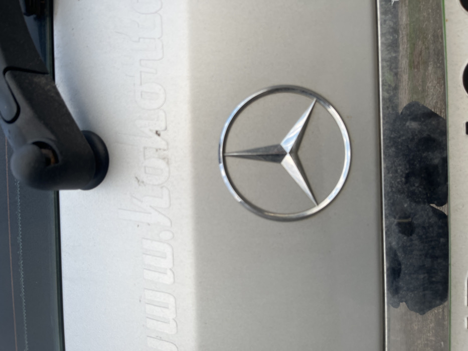 The image displays a close-up, angled view of the rear section of a light-colored vehicle, specifically a tailgate or trunk lid, located in Brežice, Slovenia. A chrome Mercedes-Benz three-pointed star emblem is centrally positioned in the lower half of the frame. Above the emblem, faded white block lettering is partially visible on the vehicle surface, beginning with "www.Ko" and continuing with indistinct characters that are obscured by dust or wear. In the upper right quadrant, a black rear windshield wiper arm is present, positioned below a dark-tinted rear window. Below the Mercedes emblem, a horizontal chrome trim strip reflects a dark, indistinct outdoor ground area, suggesting either vegetation or dirt. The vehicle's surface shows a thin layer of dust and grime. No individuals or explicit actions are depicted.