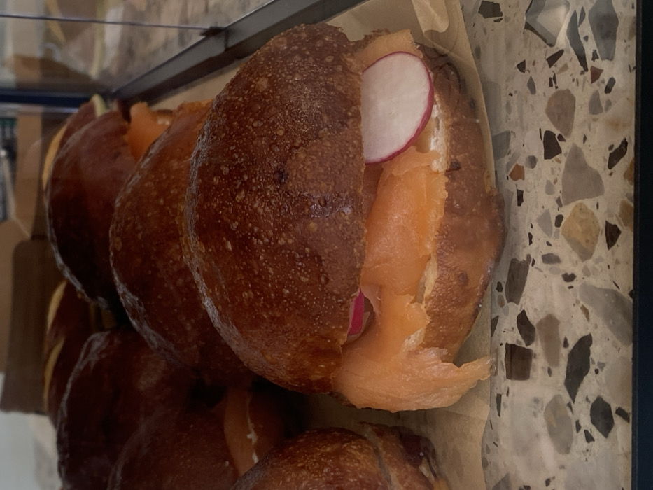 A close-up, high-angle interior shot depicts multiple round, dark brown bread rolls displayed in what appears to be a retail food setting. The foreground focuses on a split roll filled with numerous layers of orange-pink cured salmon, thin white and red-rimmed radish slices, and a visible layer of white cream cheese. Several other similar rolls, some with visible fillings, are arranged behind it on a light brown parchment or paper lining. The surface beneath the rolls is a light-colored, mottled stone or terrazzo countertop with embedded multicolored aggregate chips. A clear glass panel, consistent with a display case, is partially visible on the right edge. The general environment is consistent with a bakery or cafe in the city of Tel Aviv-Yafo, Israel, though the specific address cannot be determined from the image. No individuals are present. The scene is static, depicting food items for sale.