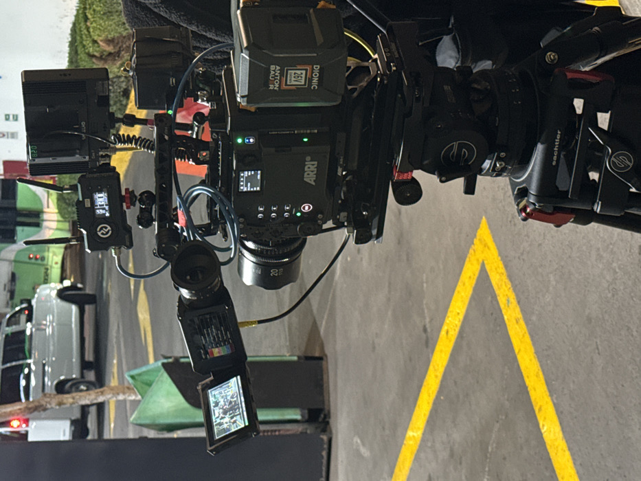 A professional film camera, ARRI brand, dominates the frame. It's mounted on a Sachtler tripod, with various attachments, including a monitor, wireless transmitter, and battery. The battery is branded Anton Bauer. The camera is surrounded by cables and accessories. A yellow painted triangle is visible on the ground, likely indicating a parking space. A vehicle with a green stripe is visible in the background.