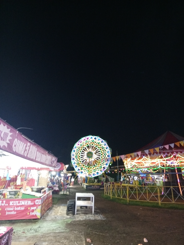 A night scene captures an outdoor market. Stalls line the left, displaying food with banners, while a carousel under a red and white striped tent occupies the right. A decorative, brightly lit, spherical structure stands between them, drawing the eye. In the foreground, a simple white table and a small stool sit on a dirt ground. The sky above is a deep, clear black.