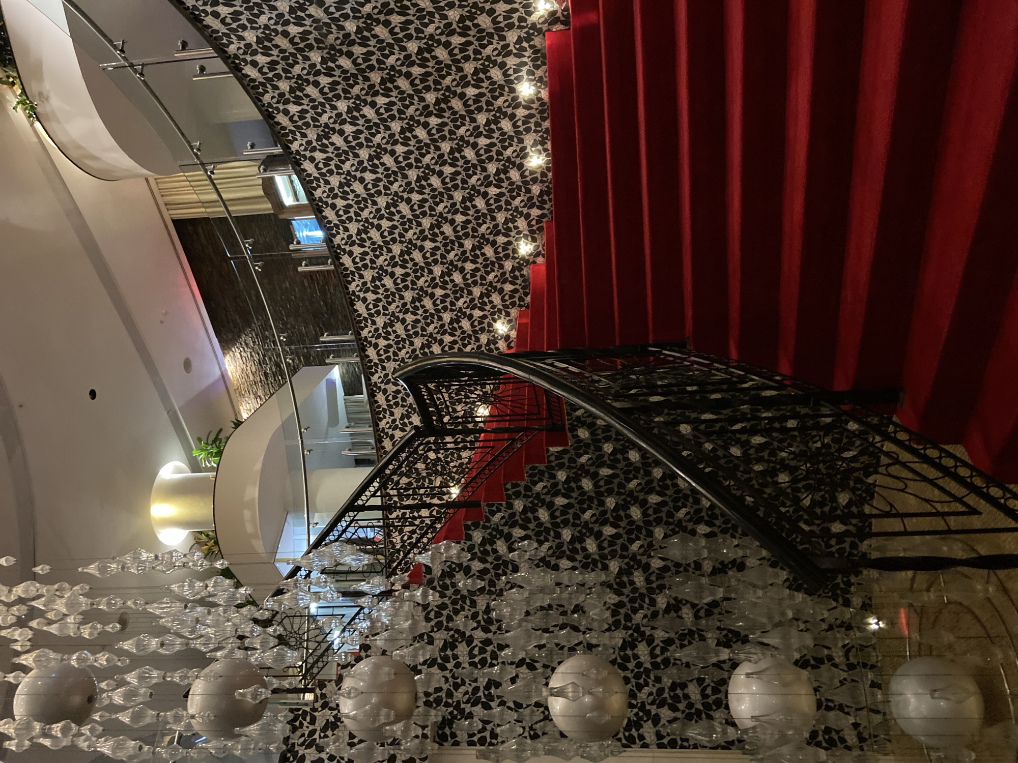 n interior staircase with a red carpet runner in a building in Boreti, Montenegro. The walls are covered in a black and white floral patterned wallpaper. A black wrought iron railing follows the curve of the staircase. In the foreground, a large chandelier with white orbs and clear glass crystals hangs from the ceiling. A white curved wall and glass elevator shaft are visible in the background.