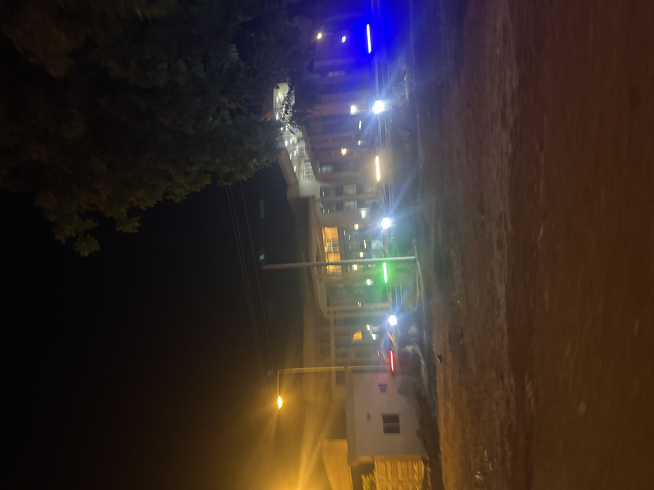 A tall building dominates the dimly lit scene, punctuated by a string of colorful lights (blue, yellow, green, red)
