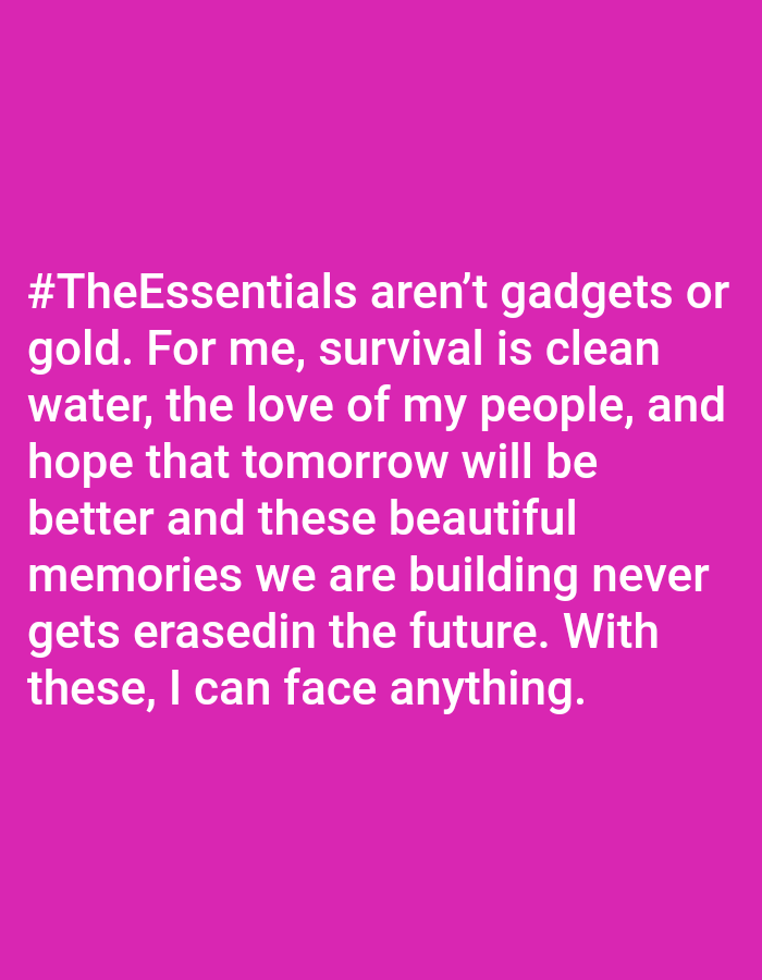 The image displays white text rendered on a solid magenta background. The text reads: "#TheEssentials aren't gadgets or gold. For me, survival is clean water, the love of my people, and hope that tomorrow will be better and these beautiful memories we are building never gets erasedin the future. With these, I can face anything." No figures, physical objects, or environmental elements beyond the text and colored background are present. The scene depicts a digital message, located in the city of Unknown, Unknown.