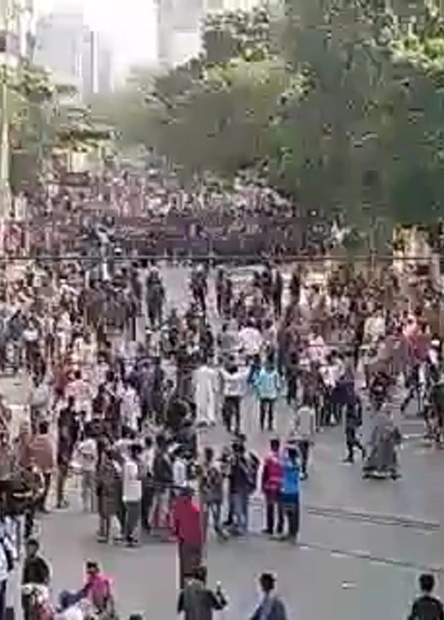large crowd of people in an urban environment. The crowd is dense, and individuals are closely packed together. Many people are moving, but the overall movement is not clearly directed. The scene appears to be a street or open space, with buildings and trees visible in the background. The people are wearing a variety of clothing. Some wear traditional attire, while others have on casual clothes. The camera angle is from an elevated position, giving an overview of the scene. It is not possible to determine the reason for the crowd’s gathering or the location.