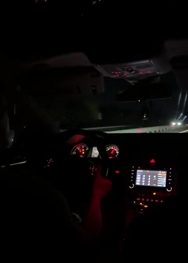 A person is driving a car at night. The interior is mostly dark, with illuminated dashboard gauges and the infotainment system screen. The driver's hands are visible on the steering wheel, and the car appears to be in motion on a road. The dashboard lights emit a red glow.