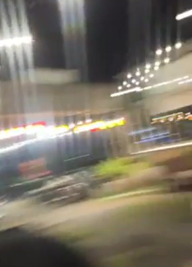 two women. The first woman appears surprised and covers her mouth with her hand. She has blonde hair and is wearing a black top. The second woman also has blonde hair and a light-colored dress or top. She's sticking her tongue out slightly and waving her hand. The background indicates they are likely outdoors at night, with overhead lights and plants visible.