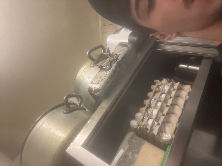 The image depicts a commercial kitchen environment, identified as being in Marseille, France. In the foreground, the right side of a male individual's face is visible, partially obscured by a dark cap. Above eye level, a stainless steel shelf holds several large, utilitarian metal cooking pots and containers; one piece, located center-right, shows pronounced surface discoloration and oxidation. Below this shelf, a clear plastic tub containing a pale, viscous substance rests next to a stack of at least three cardboard egg cartons, each containing white eggs and individually wrapped in clear plastic film. A metallic, cylindrical container is partially visible on the lower shelf to the right of the eggs. The ceiling above the shelf is light-colored and unadorned, while the area below the shelf suggests a dark storage or cabinet space.