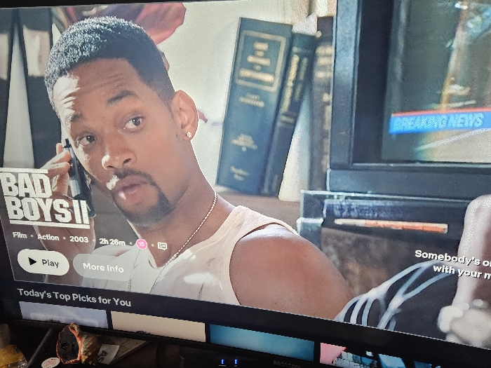 The image displays a television screen presenting a streaming service interface, showing a still from the film "Bad Boys II." The central figure on the screen is actor Will Smith, a Black male with short dark hair and a goatee, wearing a white tank top and a thin silver chain necklace, with a gold stud earring in his left ear. He is depicted holding a black telephone-like object to his left ear, looking towards the right with his mouth slightly open. In the background of the movie scene, dark bound books are visible on a shelf to the right, adjacent to a smaller television displaying "BREAKING NEWS" in blue text. Overlays on the screen identify the content as "BAD BOYS II," a "Film - Action - 2003" with a duration of "2h 26m." A pink circular icon and another small white icon are present next to the duration. Below the title, "Play" and "More Info" buttons are displayed. White subtitles on the right side of the screen partially read, "Somebody's o[ut] with your m[oney]". A dark bar near the bottom of the screen reads "Today's Top Picks for You," above a row of partially visible content thumbnails. The physical black frame of the television is visible at the bottom and partially on the right. Blue indicator lights are discernible on the bottom edge of the television's frame. Beneath the television, a dark, textured surface supports the device. On this surface, to the left, an irregularly shaped orange-brown object and some translucent white material are present. The image itself contains no discernible information regarding its specific location within the Cherwell District, United Kingdom.