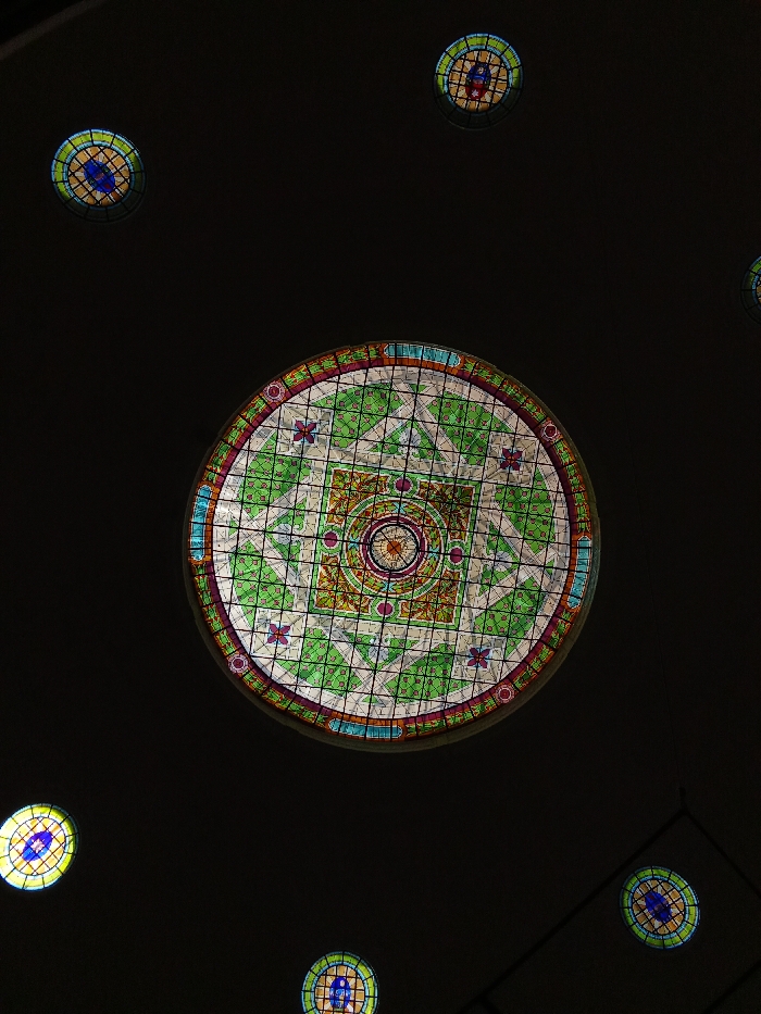 - "This image captures a low-angle view of a circular stained glass dome and multiple smaller circular stained glass windows set against a dark ceiling, specifically located within the Pasaje San Martín in Mendoza, Argentina" by FM-Luk4a2, licensed under CC BY 4.0