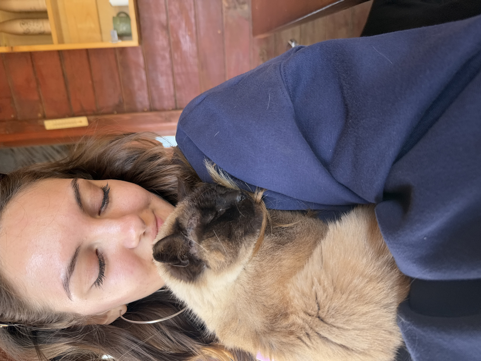 - "A young woman with brown hair and closed eyes is cradling a Siamese cat in a blue hooded sweatshirt" by FM-lXJx72, licensed under CC BY 4.0