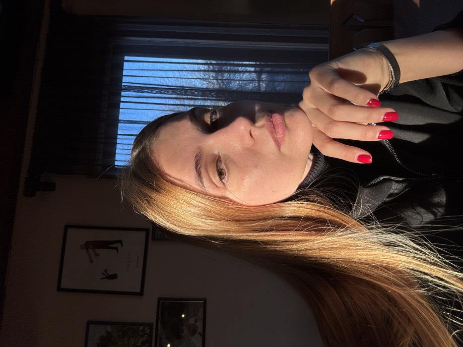 The scene depicts an adult female positioned indoors, contextually located in Sighnaghi, Georgia. The female, appearing to be in her 20s or 30s, possesses fair skin, light brown or hazel eyes, and long, straight light-brown hair illuminated by a strong natural light source from the right. She wears a dark, possibly black, turtleneck top with a visible zipper detail. Her left hand is raised, with fingers resting beneath her chin, showcasing short nails painted a vibrant red. A slender bracelet and a darker band are visible on her left wrist. She maintains a direct gaze towards the camera with a neutral expression. The background features a light-colored wall with two framed pictures. The upper frame contains a white-background artwork depicting a stylized hand making a peace sign pointing towards a figure with outstretched arms. The lower left frame shows a portrait of a person with two bright reflections in its background. To the right, a window covered by dark, sheer curtains reveals a bright blue sky and the faint outlines of bare tree branches outside. Sunlight streams in through this window, creating distinct shadows on the female's face and within the room. A dark wooden surface is partially visible in the lower right corner.