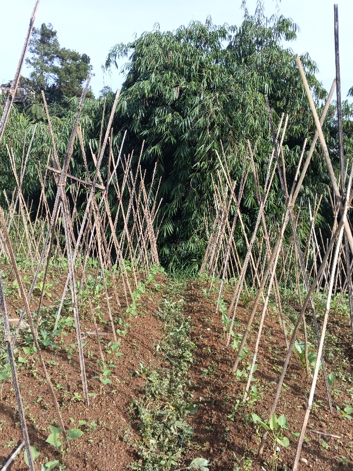 A field of young plants supported by crisscrossed bamboo stakes stretches into the distance. The stakes form a repeating X pattern above the rows of greenery. Rich, red-brown soil fills the foreground, interspersed with weeds and small sprouts. In the background, dense bamboo trees form a lush green backdrop, partially obscuring other trees and a clear sky. The scene suggests a rural or agricultural setting.