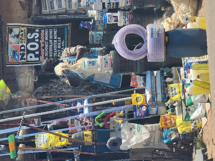 An outdoor market stall or shop in Maiburiji, Nigeria, displays various goods and services under bright daylight