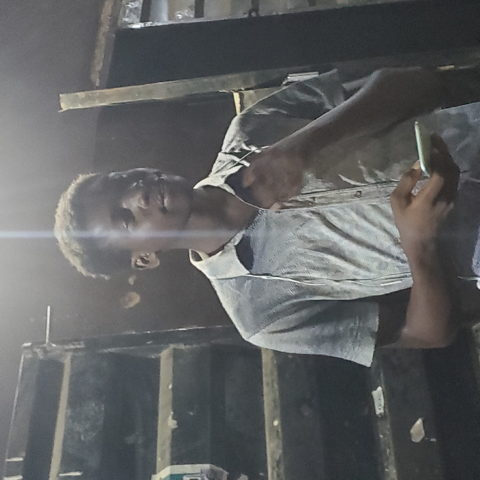 An African male individual stands indoors in Ihiagwa, Nigeria, under low-light conditions with a prominent overhead artificial light source