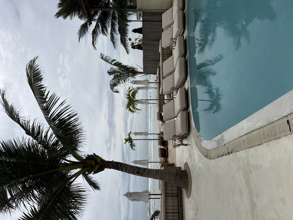 The image showcases a tranquil tropical scene featuring a palm tree in the foreground. A row of beach chairs lines the side of a swimming pool, reflecting the sky and nearby palm trees. Beyond the chairs, there's a view of the ocean, visible between palm trees and beach umbrellas. The sky is overcast, suggesting a cloudy day. The overall atmosphere is peaceful and serene, conveying a sense of relaxation and leisure.