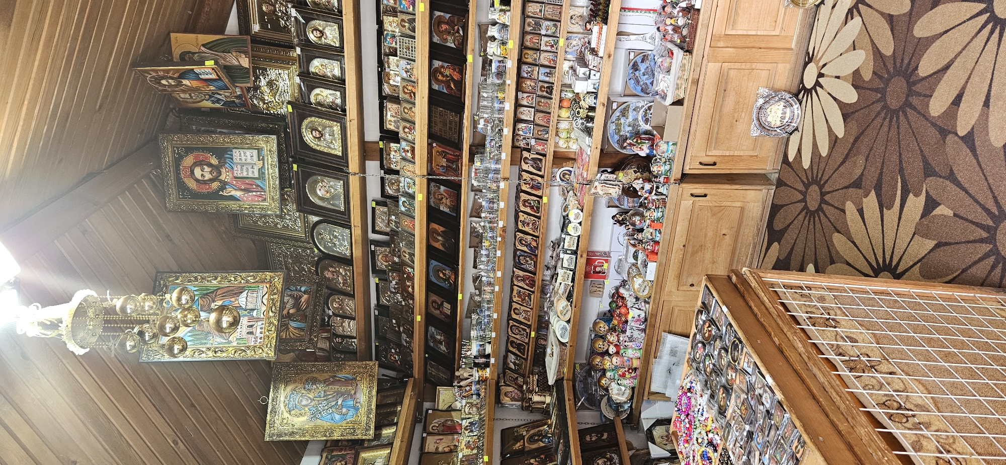 The image captures the interior of a souvenir shop, likely located within or directly adjacent to the Rila Monastery complex in Rilski manastir, Bulgaria. The ceiling is composed of light-colored wooden planks forming an upward-sloping, angled structure. An ornate, golden-colored chandelier with multiple spherical light fixtures hangs from the ceiling, supplemented by an exposed, bright light source causing a lens flare in the upper center. The shop is extensively furnished with wooden shelving units and lower wooden cabinets with dark handles, displaying a dense array of merchandise. The primary items are Orthodox Christian icons of various sizes, both framed and on wooden plaques, depicting Jesus Christ, the Virgin Mary with Child, and various saints. These icons line multiple shelves, some arranged in neat rows, others stacked. Beyond icons, other souvenir items are visible: rows of clear glass mugs and shot glasses, decorative plates, sets of Russian nesting dolls (matryoshka), small figurines, likely snow globes or Nativity scenes, and various small decorative items. A large, rectangular wooden display counter in the foreground presents numerous small, flat items, possibly magnets or postcards, alongside strands of colorful beaded bracelets and necklaces. The floor is covered with a patterned rug featuring large, stylized daisy-like floral motifs in varying shades of brown and beige. No individuals are present in the scene.