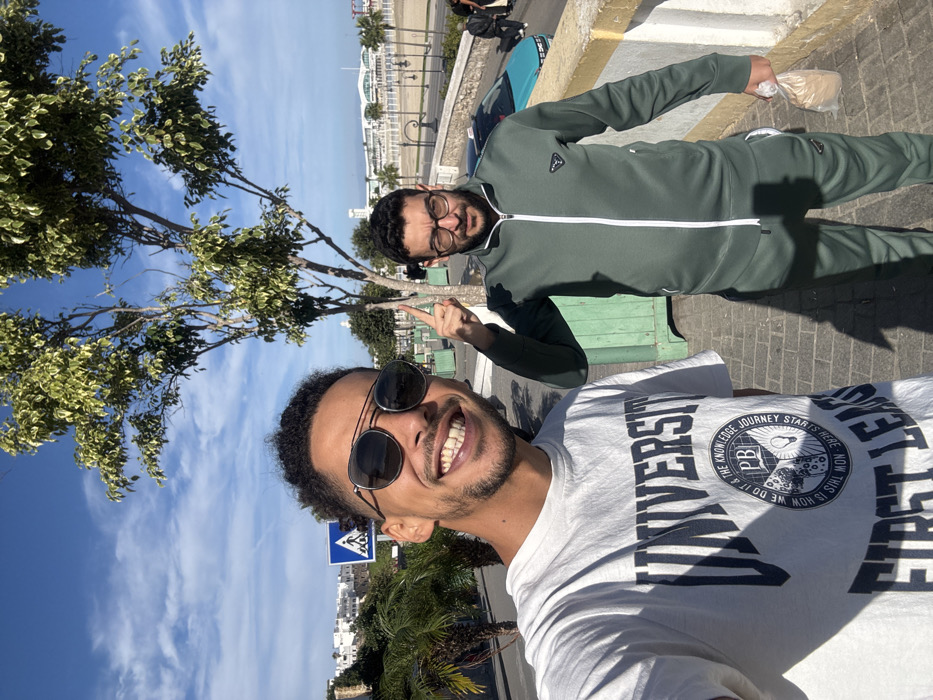 Two adult males are depicted outdoors on a sunny day in Tangier, Morocco, on a paved sidewalk overlooking a street and urban waterfront. The male in the foreground, left of center, has dark curly hair, a short beard, and wears sunglasses with a double-bar frame. He wears a white t-shirt with a dark blue "UNIVERSITY FIRST LEAGUE" graphic. He smiles broadly, facing the camera, apparently taking a selfie. The second male, positioned slightly behind and to the right, has dark hair, a full beard, and wears eyeglasses. He is dressed in a dark green tracksuit with white stripes and a white Prada logo on the left chest. His right index finger is pointed upwards, and he holds a small, light brown paper bag in his left hand. The immediate environment includes a low yellow and white concrete barrier in the foreground. A green wooden structure is visible behind the second male. A deciduous tree with variegated light green and yellow leaves stands prominently between the subjects and the background. To the far left, a blue pedestrian crosswalk sign with a white pictogram is visible, alongside palm trees and white multi-story buildings on a hillside. A turquoise-colored compact car is parked on the street behind the subjects. The distant background features a large modern port complex with multiple white buildings and structures along a waterfront, under a clear blue sky with scattered cirrus clouds. Strong shadows are cast on the ground, indicating direct sunlight.