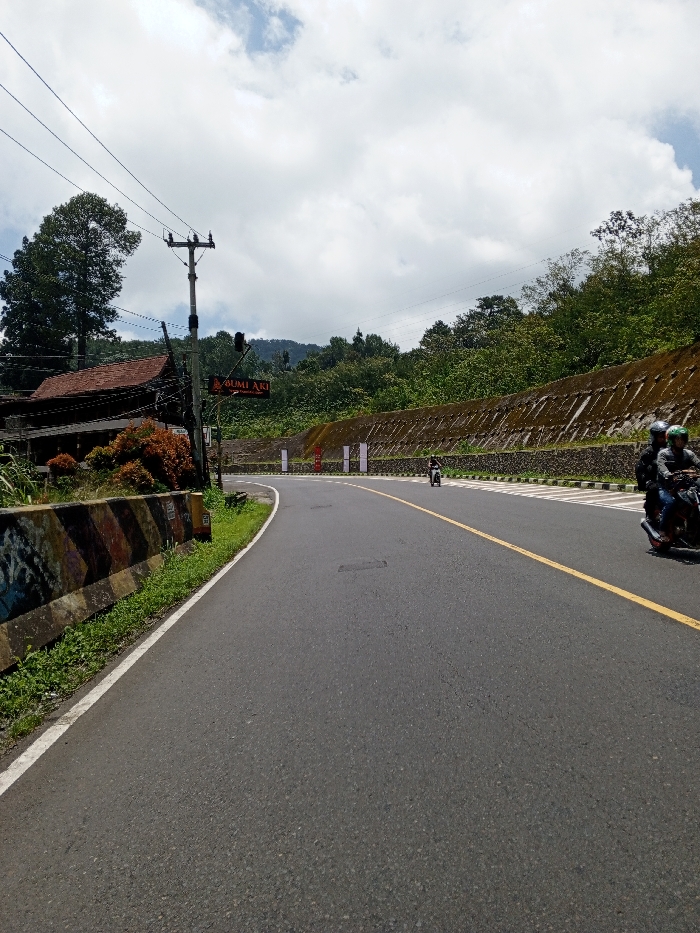 The image displays a paved asphalt road in Multhan, India, under a partly cloudy daytime sky. The road features a double solid yellow centerline and a solid white line marking the left shoulder, curving gradually to the right in the distance. Two motorcycles are visible, both traveling away from the camera. In the foreground right, two individuals ride a dark-colored motorcycle; the driver wears a dark helmet, and the passenger wears a light green helmet. Further ahead, a single individual on a lighter-colored motorcycle also wears a dark helmet. To the left of the road, a concrete barrier with diagonal brown, black, and light yellow stripes borders the pavement. Beyond this, a strip of green grass and a utility pole with multiple overhead wires are present. Behind the pole, a building with a reddish-brown tiled roof and dark wooden elements is partially obscured by reddish-brown bushes. A sign with red lettering on a dark background, reading "BUMI AKI," is affixed near a single dark traffic light head. A large green tree stands prominently behind this structure. To the right of the road, a moss-covered concrete retaining wall extends along the curve, topped with dense green foliage and trees. Several evenly spaced white rectangular banners or signs are visible along the retaining wall in the mid-distance. The background consists of green, forested hills or mountains.