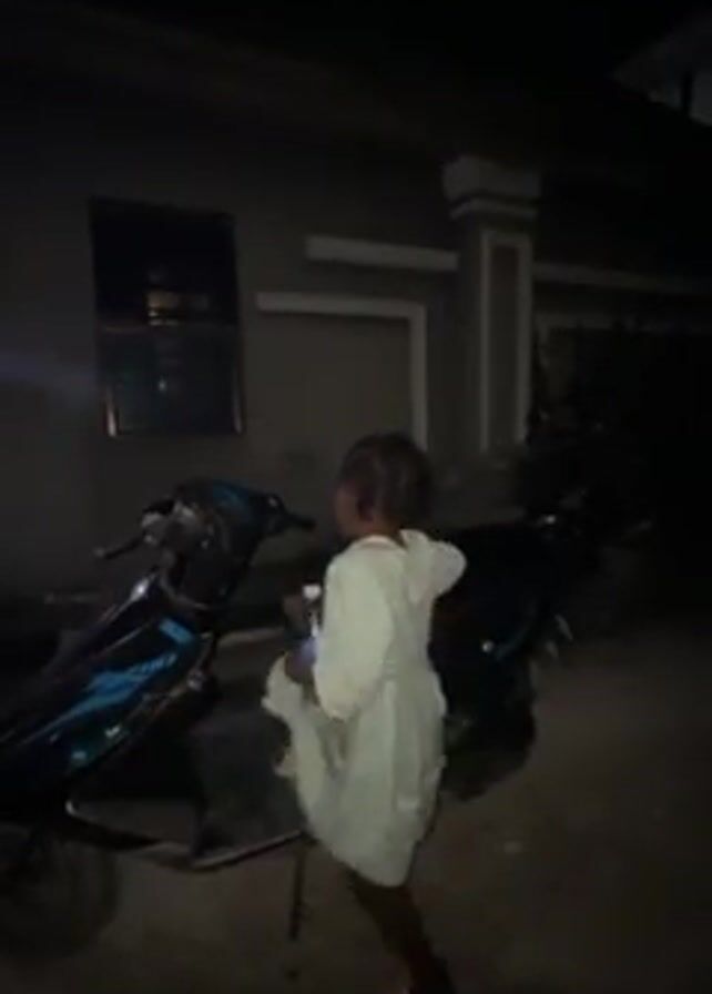 At night, a small child in a light-colored dress and white Crocs is near a parked black and blue scooter outside a house. The child holds a blue water bottle. The house is gray and has a window and decorative pillars. The child tries to climb onto the scooter, stumbles, but then playfully reaches for the scooter's handlebar and smiles.