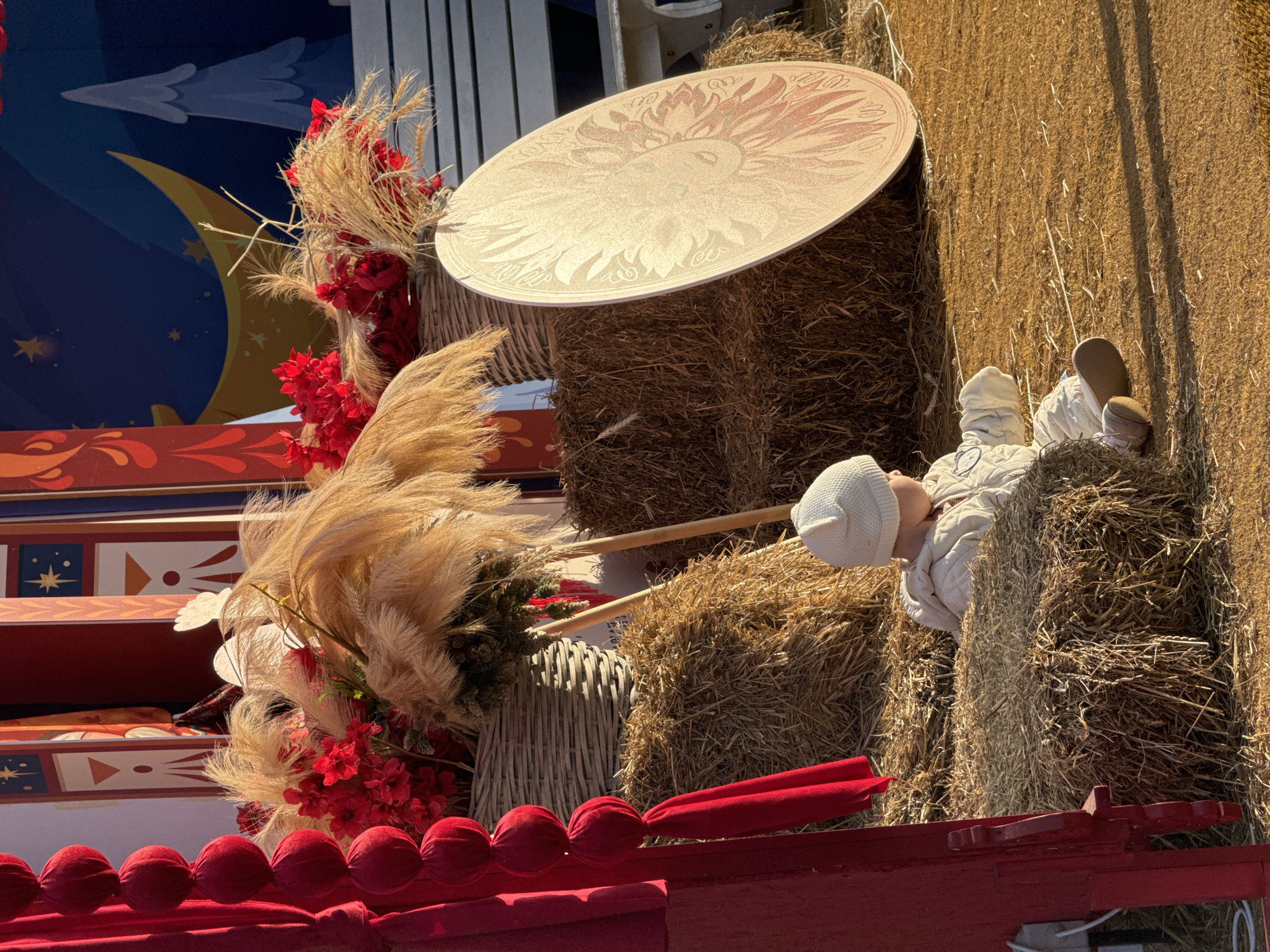 The scene depicts an outdoor decorative display in Odintsovo, Russia, featuring an infant. An infant, dressed in a light-colored quilted snowsuit and a matching knitted cap, sits on a hay bale, facing right, with its back partially visible. Light-colored shoes are visible on the infant's feet. The ground is covered by a textured brown mat, upon which multiple rectangular hay bales are arranged. In the background, two large woven baskets hold elaborate floral and botanical arrangements, featuring abundant light-brown pampas grass, clusters of red artificial flowers, and dried wheat stalks. A large, circular, light-colored wooden disc with a stylized sun emblem is propped against a hay bale on the right side of the frame. To the far left, a vertical red fabric element adorned with stacked spherical pom-poms hangs next to a red wooden structure. Behind the display, a dark blue mural depicts a yellow crescent moon, stars, and a stylized light blue evergreen tree. A white slatted bench is partially visible further to the right. Strong, low-angle sunlight illuminates the scene, casting defined shadows across the mat.