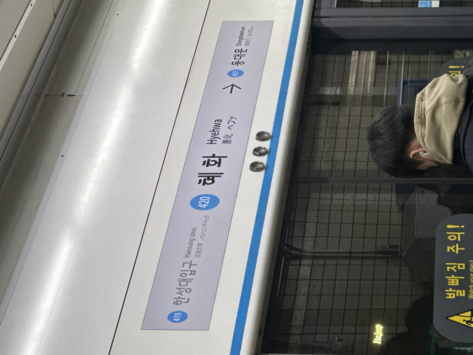 subway sign indicating the current and next stations. The current station is Hyehwa (혜화), station number 420. The previous station is Hanseong University (한성대입구), station number 419. The next station is Dongdaemun (동대문), station number 421. The information is displayed in Korean, English, Japanese, and Chinese. There is also a "Watch your step!" warning visible on the lower right of the image. A person is reflected in the subway car window.