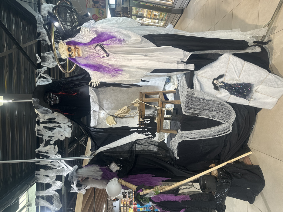 This image depicts an elaborate Halloween-themed retail display located within a commercial establishment in Mornas, France