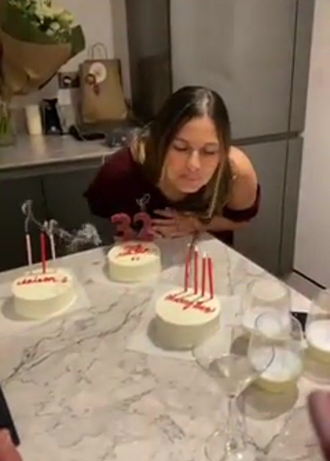 A woman in a maroon dress is celebrating her 32nd birthday in a kitchen. Three small, round cakes are on the marble countertop in front of her. Each cake has white frosting and red writing. The cakes are labeled "Adriam," "32," and "Happy Birthday," respectively. Each cake also has candles that have just been blown out and are smoking. To the side of the cakes are several glasses, a martini glass, and a vase of flowers. Behind the woman are kitchen cabinets and a refrigerator. Another person is partially visible in the foreground, holding a phone to record the scene. The woman claps her hands and smiles.