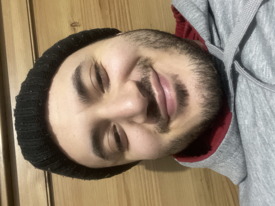 - "A close-up, slightly rotated portrait shows a man with closed eyes, wearing a black beanie and a gray hoodie with a red lining" by FM-ekT8x1, licensed under CC BY 4.0