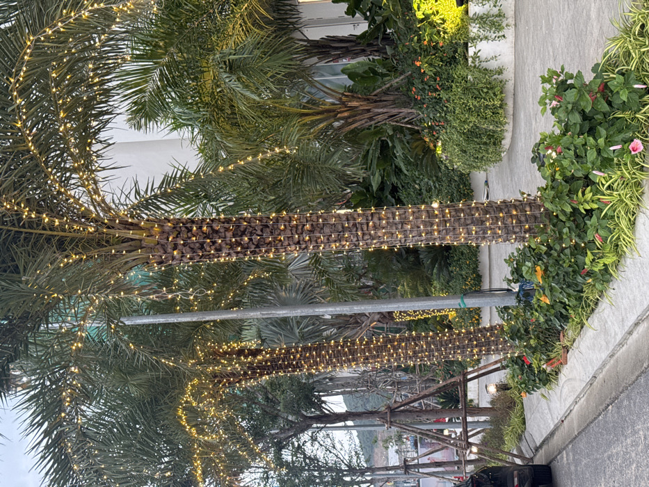 The image portrays an illuminated urban landscape in Vĩnh Lương, Vietnam, at dusk or early night. The foreground features a dark-colored vehicle's rear left side on a grey paved surface, bordering a concrete curb. Immediately behind the curb, a structured planter bed contains a variety of lush green shrubs, interspersed with flowering plants exhibiting red, orange, and pink blooms, alongside variegated green and white foliage. Several small, discrete ground-level lights illuminate this greenery. Dominating the mid-ground are three mature palm trees with textured trunks, heavily adorned with strings of small, warm-white LED lights that extend from their bases to their fronds. A grey utility pole stands centrally between two of these palm trees. Further back, additional palm trees and dense, darker green foliage contribute to the landscaped environment. To the left, several young trees are visible, stabilized by wooden support structures. The background reveals a partial view of a modern, multi-story building with a light-colored facade, beyond which distant, dark green hills or mountains are silhouetted against a light grey sky. No individuals are present in the scene, and no actions or interactions are observed.