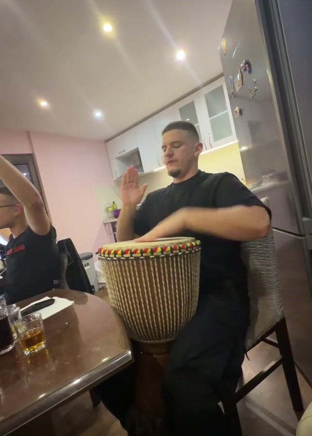 Two young men are in a kitchen. One is drumming on a djembe drum, the other is sitting to his left at a wooden table. The drummer is wearing a black t-shirt and pants. The man at the table is wearing a black t-shirt with white writing on it. He is holding his phone and appears to be recording. There is a glass with a dark liquid and ice on the table, along with papers. The kitchen has pink walls and white cabinets. A stainless steel refrigerator is visible behind the drummer. The drumming creates a lively rhythm.
