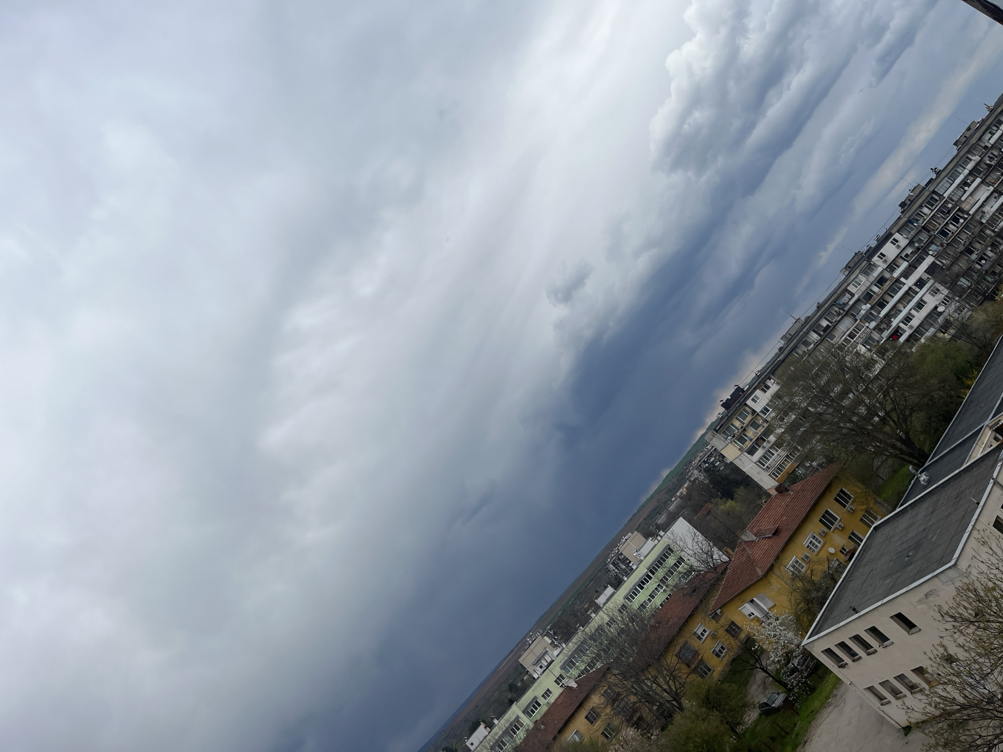 A slightly tilted medium shot shows an urban landscape under a sky filled with thick, dark storm clouds. Buildings with varied architectural styles and heights are clustered together. The scene appears to be in Lovech, Bulgaria, inferred from visual context. To the right, tall, apartment buildings with rows of balconies dominate the skyline. Lower structures with red-tiled roofs and light-colored facades are scattered in the foreground and midground. Trees with bare branches punctuate the cityscape, suggesting either late autumn or early spring. The sky transitions from light grey clouds on the left to a looming mass of dark, stormy clouds that dominate the center and right of the frame. No people are visible in the shot. The overcast lighting casts a muted tone over the scene.